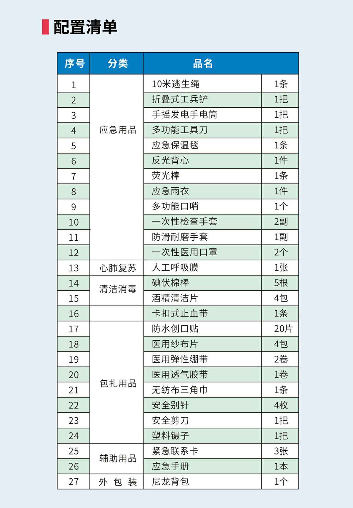 防灾应急包,适合突发灾害事故时恶劣环境下使用,配置全面、科学,满足从日常保健到灾难自救逃生的全面需求。